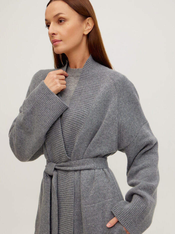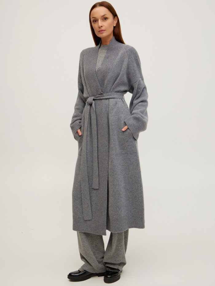 Жіноче сіре в’язане пальто з напіввовни ягняти 5094